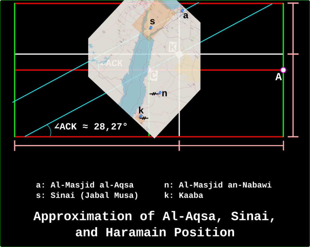 Dengan memplot lintang dan bujur Bumi pada kisi dua dimensi, kita dapat menganalisis koordinat Kakbah (21,423 derajat Lintang Utara, 39,826 derajat Bujur Timur). Jarak dari titik ini ke garis-garis global utama, seperti anti-meridian (garis bujur 180 derajat) serta Kutub Utara dan Kutub Selatan, menghasilkan rasio yang sangat mendekati rasio kunci Fibonacci, seperti 5:8 dan rasio yang hampir sempurna 13:8.