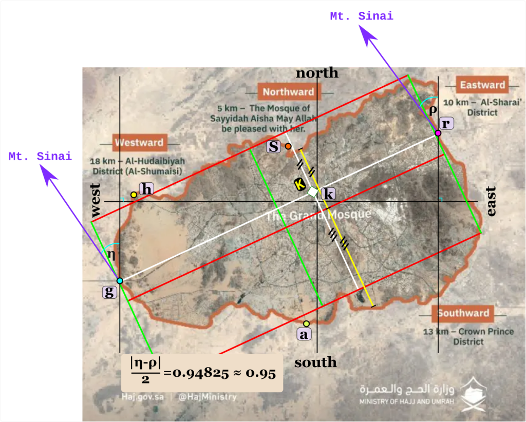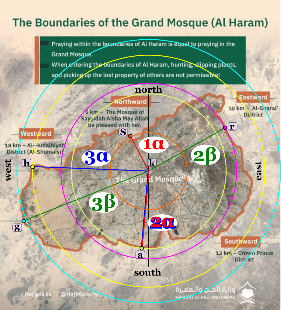 Lebih lanjut, batas-batas Haram—tanah suci yang mengelilingi Mekah—menunjukkan konsistensi proporsionalnya sendiri. Jarak dari Ka’bah ke beberapa batas Haram di keempat arah mata angin membentuk rasio sederhana seperti 2:1 dan 3:2.