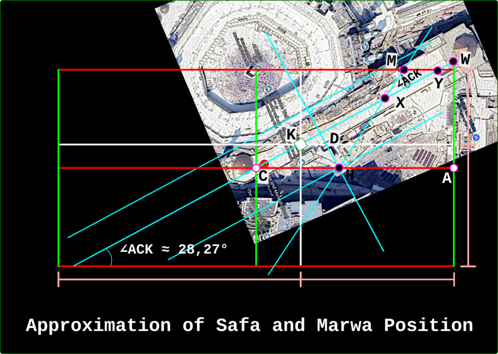 Analisis ini juga meluas ke area terdekat. Hubungan geometris antara Kakbah dan Maqam Ibrahim (Tempat Berdiri Nabi Ibrahim) tampaknya mencerminkan hubungan yang lebih besar antara Kakbah dan pusat koordinat Bumi, karena keduanya berbagi sudut tertentu.